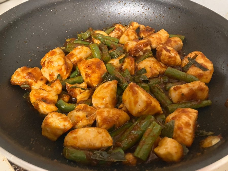 Add curry paste, palm sugar and leaves, stirring until the sugar melts.