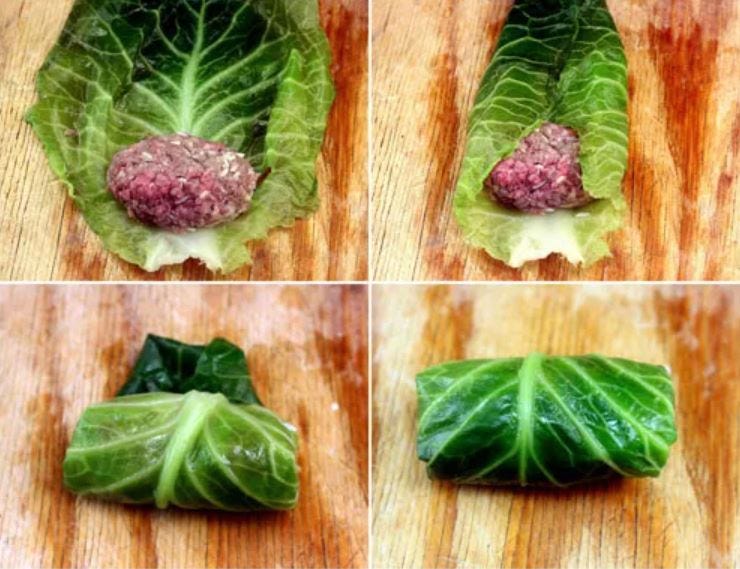 Wrap the meat mixture in the leaves, folding the sides first as shown below. Roll up the leaf loosely, as the rice will expand. Repeat with more leaves until all the filling is used. Place the rolls seam side down to cook.